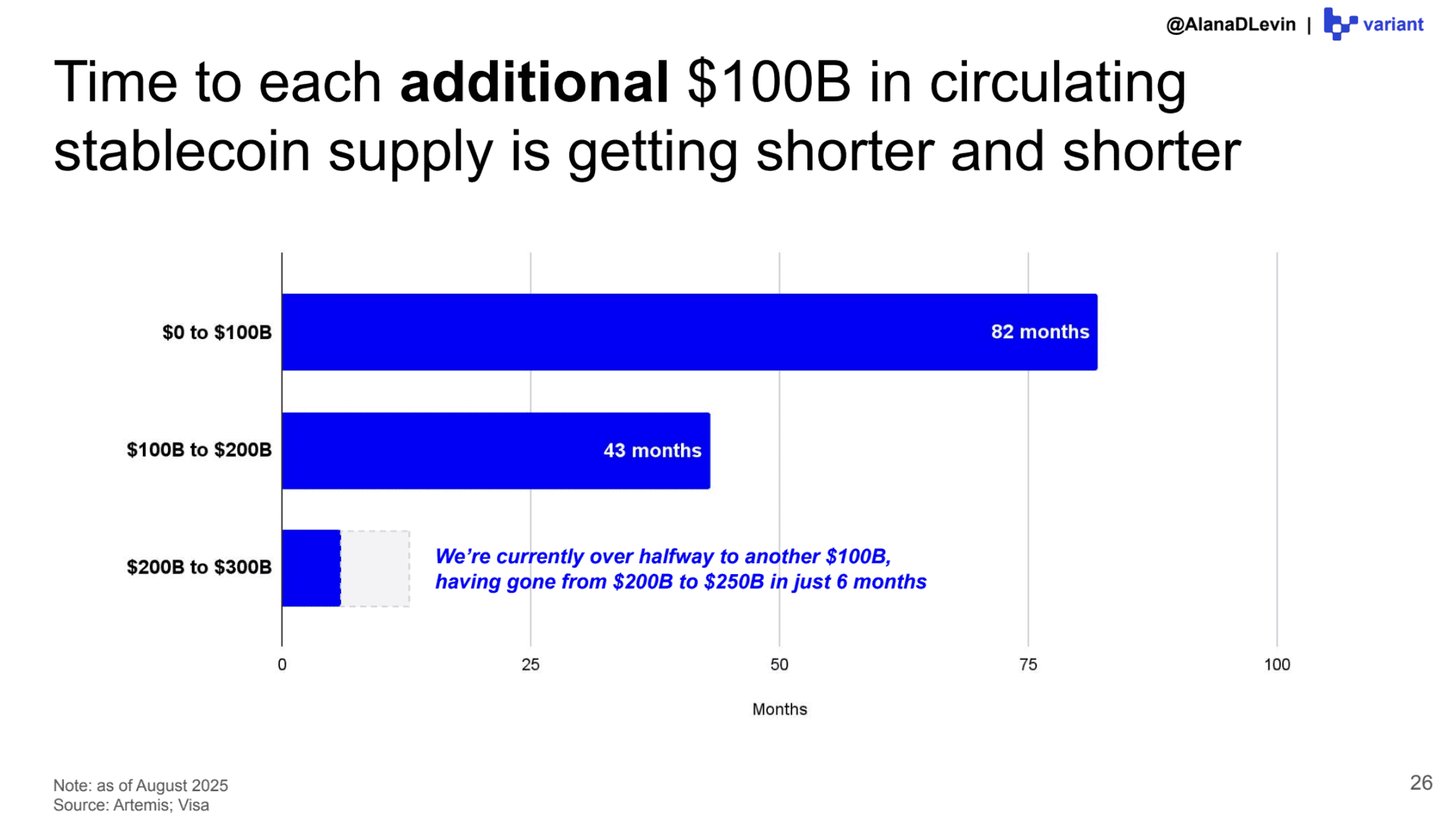 In this post I'll try to avoid all of the basic or mundane stablecoin facts you more than likely already know, and present a case for what the future of stablecoins looks like beyond just extrapolating total supply growth - because that's boring! I say that it's boring because anyone can point to the supply chart and come to the conclusion that clearly these digital representations of US dollars are quite a hit, and reasonably assume the chart will continue rapidly trending up and to the right. Alana Levin of Variant also did the work for us with this chart from her recent 2025 crypto trends report, which I highly recommend checking out: